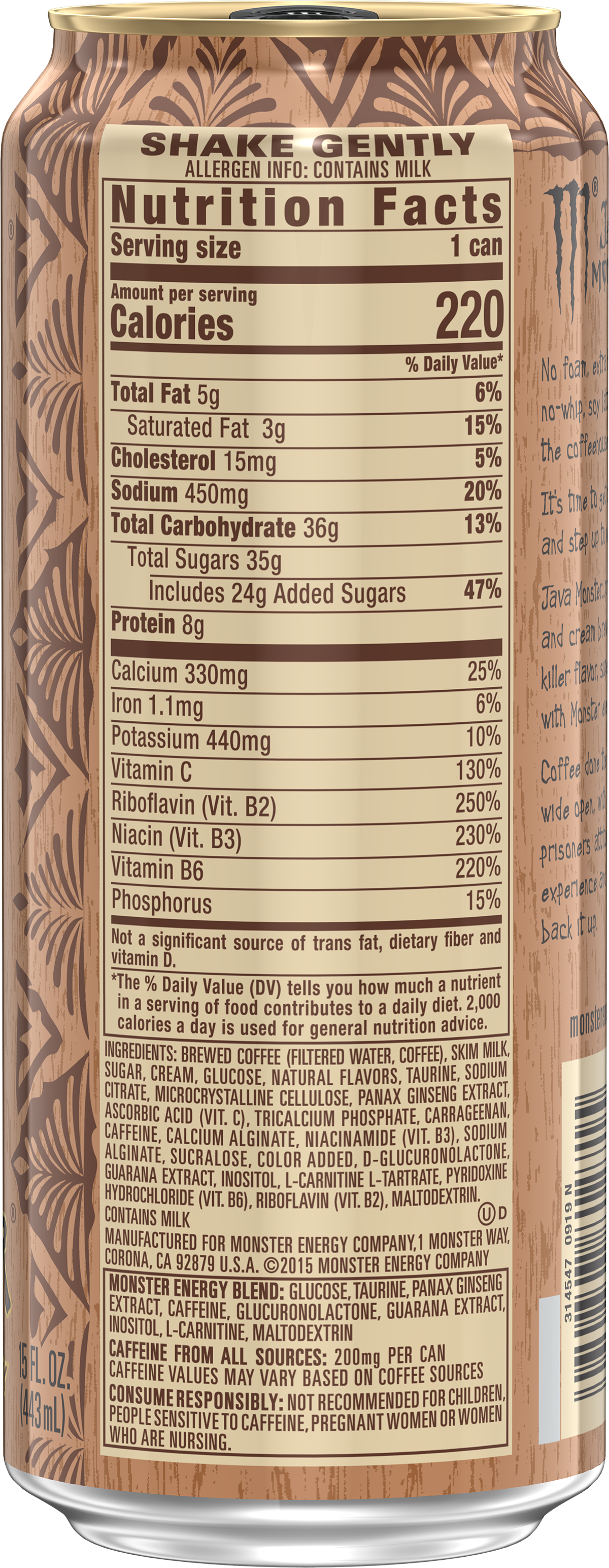 Java Monster Cold Brew Sweet Black Energy Drink - Target With zero sugar, just a touch of sweetness at only 10 calories per can and a full load of our legendary energy blend, Monster Cold Brew kicks like no other. Great Taste, No Compromise! If the item details above aren't accurate or complete, we want to know about it. Report incorrect product info. More to consider $3.99 Monster Energy Java Loca Moca, Coffee - amazon.com Coffee done the Monster way, wide open, with a take no prisoners attitude and the experience and know-how to back it up. KILLER FLAVOR : Loca Moca Java Monster premium coffee and cream brewed up with a killer Mocha flavor, supercharged with the Monster energy blend and 188mg of caffeine per can. Monster Energy Java Monster Loca Moca, Coffee - H-E-B Java Monster Loca Moca, Coffee + Energy Serving Size 1.00 can (240ml) Serving Per Container (per can) Amount Per Serving %DV IS or Contains: Kosher,Milk *Percentage Daily values are based on a 2,000 calorie diet.Your Daily values may be higher or lower depending on your calorie needs Calories in Monster Beverage Java Monster Salted Caramel and Nutrition ... Java Monster Salted Caramel Nutrition Facts Serving Size 1 can (443 ml) Amount Per Serving Calories 180 % Daily Values* Total Fat 5.00g 6% Saturated Fat - Trans Fat - Cholesterol - Sodium - Total Carbohydrate 28.00g 10% Dietary Fiber - Sugars - Protein 7.00g Vitamin D - Calcium - Iron - Potassium -