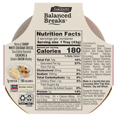 Sargento Balanced Breaks Nutrition Facts • MyFoodDiary® 190 calories. Log food. Sargento Balanced Breaks w/ White Cheddar, Cashews & Raisins. 1 tray (43g) Nutrition Facts. 180 calories. Log food. Sargento Balanced Breaks Wheat Thins w/ Monterey Jack & Mild Cheddar. Sargento® Balanced Breaks® Natural White Cheddar Cheese, Sea-Salted ... Balanced Breaks® products make a delicious snack for tossing into backpacks, briefcases and gym bags to provide a delicious on-the-go boost. Each individual serving contains 7 grams of protein and less than 200 calories*. Convenient individual-sized snack trays come in a 6-count package.