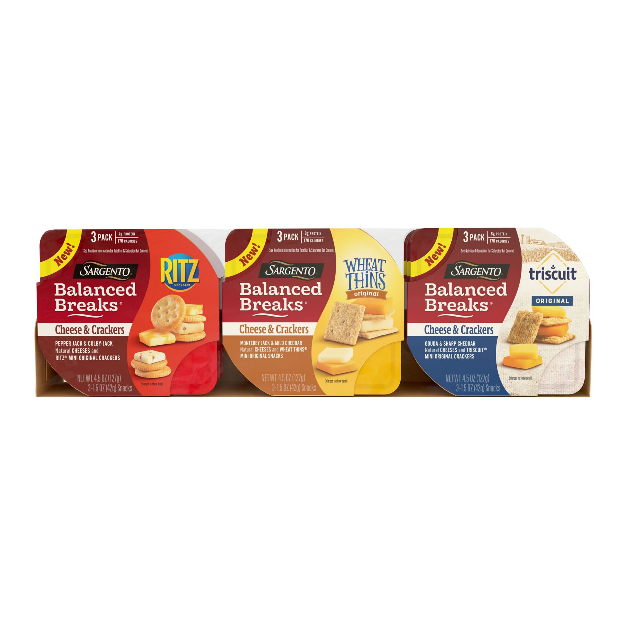 Sargento® Balanced Breaks® Cheese & Crackers, Gouda & Sharp Cheddar ... 3 pack Sargento ® Balanced Breaks ® Cheese & Crackers, Gouda & Sharp Cheddar Natural Cheeses and TRISCUIT ® Mini Original Crackers Snack Kit, 3-Pack 8G PROTEIN UNDER 200 CALORIES Enjoy 100% real, natural cheeses, Gouda and Sharp Cheddar with salty, crispy TRISCUIT ® crackers for a delicious, satisfyingly snack break.