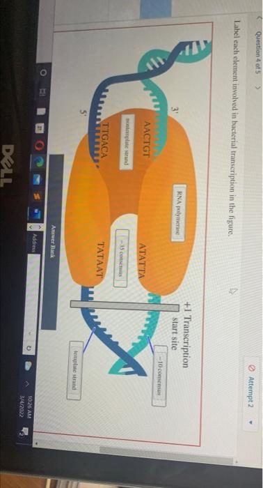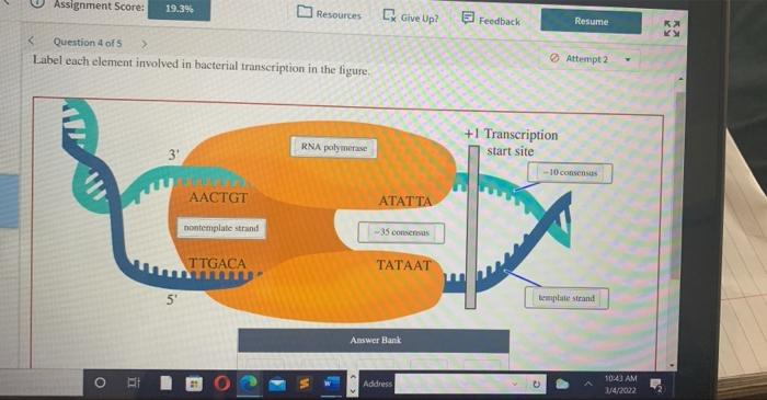 Solved 2 of 25 > Label each element involved in bacterial | Chegg.com Answer to Solved 2 of 25 > Label each element involved in bacterial. Science; Biology; Biology questions and answers; 2 of 25 > Label each element involved in bacterial transcription in the figure. +1 Transcription start site 3' AACTGT ATATTA TTGACA TATAAT 5 Answer Bank -10 consensus template strand nontemplate strand RNA polymerase -35 consensus
