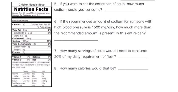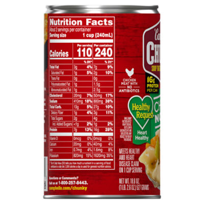 Thai Chicken Soup With Coconut Milk (Tom Ka Gai) Recipe May 01, 2021 · Add the lime juice and stir. Do a taste test. Look for a balance between spicy, sour, salty, and sweet flavors. Start with saltiness, adding more fish sauce if the soup is not salty or flavorful enough, 1 tablespoon at a time. Food Labels: Campbell's Chicken Noodle Soup (Warning: May ... - HubPages Reading the Label We are told that a serving size is ½ cup of condensed soup, which will serve 2.5 people, and that there are 60 calories per serving or which 20 are fat calories. Okay, so far so good…..kind of! This can before me has 2 grams of total fat, 0.5 g of saturated fat, and 0.5 g of monounsaturated fat.