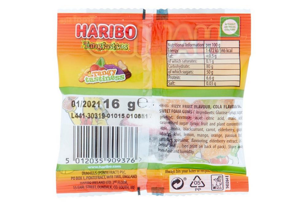 Haribo Starmix Mini Bag 16G - Tesco Groceries Treat size; Now with fruit juice; Iconic favourites; Without Artificial Colours; ... Haribo Ireland Ltd, Return to. Dunhills (Pontefract) PLC, PO Box 1, Pontefract, WF8 1WX, England. ... so ingredients, nutrition content, dietary and allergens may change. You should always read the product label and not rely solely on the information provided ...