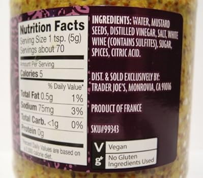 Dijon mustard ingredients label. Calories in Dijon Mustard - Nutritionix Dijon Mustard ; 0.2 g 0.2 g, salt, 0.0 ; 1 teaspoon 5.2 g, mustard, 3.1 ... Homemade Dijon Mustard Recipe - Flour On My Face How to can Homemade Dijon Mustard Ingredients 2 cups chopped onion 6 garlic cloves, coarsely chopped 2 cups Pinot Grigio or other dry white wine 1 cup white wine vinegar (5% acidity) 1 teaspoon table salt 4 whole black peppercorns 1 rosemary sprig 1 cup yellow mustard seeds ⅓ cup dry powdered mustard 2 ⅔ cups water Directions Calories in Dijon Mustard and Nutrition Facts - FatSecret Monounsaturated Fat 0.129g Cholesterol 0mg 0% Sodium 67mg 3% Total Carbohydrate 0.47g 0% Dietary Fiber 0.2g 1% Sugars 0.17g Protein 0.24g Vitamin D - Calcium 5mg 0% Iron 0.11mg 1% Potassium 9mg 0% Vitamin A 0mcg 0% Vitamin C 0.2mg 0% H-E-B Select Ingredients Dijon Mustard - Shop Condiments at H-E-B We use mustard seed for flavor and color Not Yellow 5 or 6. Preparation instructions Shake well before use. Refrigerate after opening. Expiration date on bottle. Ingredients Water, Mustard Seed, Distilled Vinegar, Salt, White Wine, Citric Acid, Tartaric Acid, Spices. Safety warning PERISHA