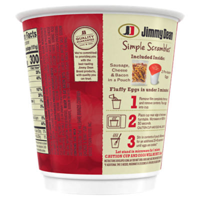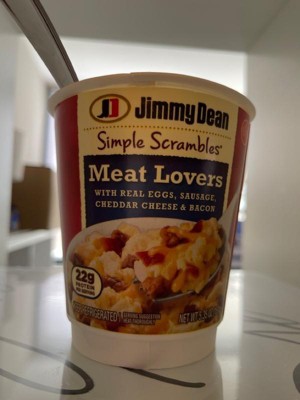 Jimmy Dean Simple Scrambles Meat Lovers - 5.35oz : Target Jimmy Dean Simple Scrambles Meat Lovers - 5.35oz $3.39When purchased online In Stock Add to cart About this item Highlights One 5.35 oz. microwave-safe cup Two real liquid eggs Pouch of fully cooked premium pork sausage, bacon, and cheddar cheese Excellent source of protein - 23 grams per serving Simply combine, heat, and eat