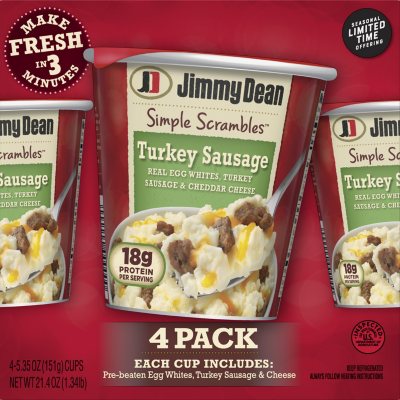 Jimmy Dean Simple Scrambles® Meat Lovers, 5.35 oz. Jimmy Dean Simple Scrambles Meat Lovers, 5.35 oz. Wake up and enjoy a fresh-made breakfast with Jimmy Dean Meat Lovers Simple Scrambles. Made with two real eggs, premium pork sausage, bacon, and cheddar cheese, our Simple Scrambles are packed with 23 grams of protein per serving for a hearty breakfast that’s ready in seconds. Jimmy Dean Simple Scrambles® Steak & Cheddar Breakfast Cup Wake up and enjoy a fresh made breakfast with Jimmy Dean Simple Scrambles® Steak & Cheddar Breakfast Cups. Made with real eggs, diced steak and cheddar cheese, our Jimmy Dean Simple Scrambles® breakfast cups are packed with 24 grams of protein per serving for a hearty breakfast that’s ready in seconds. Simply combine, heat, and eat for a ...