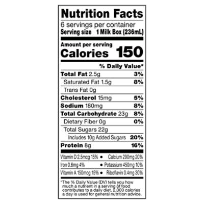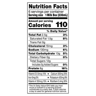 Horizon Organic Whole Milk, 6 ct / 8 fl oz - Harris Teeter Ship. Unavailable ; Nutrition Facts. servings per container. Serving size1 Milk Box (236mL). Amount per serving. Calories150. % Daily value*. Total Fat8g10%. Horizon Organic Whole Milk, Half Gallon - Danone Away From Home Nutrition Facts · Amount/Serving %DV* · Total Fat 8g 12% · Saturated Fat 5g 25% · Trans Fat 0g · Polyunsat Fat 0g · Monuunsat Fat 2.5g · Cholesterol 35mg 11% · Sodium ...