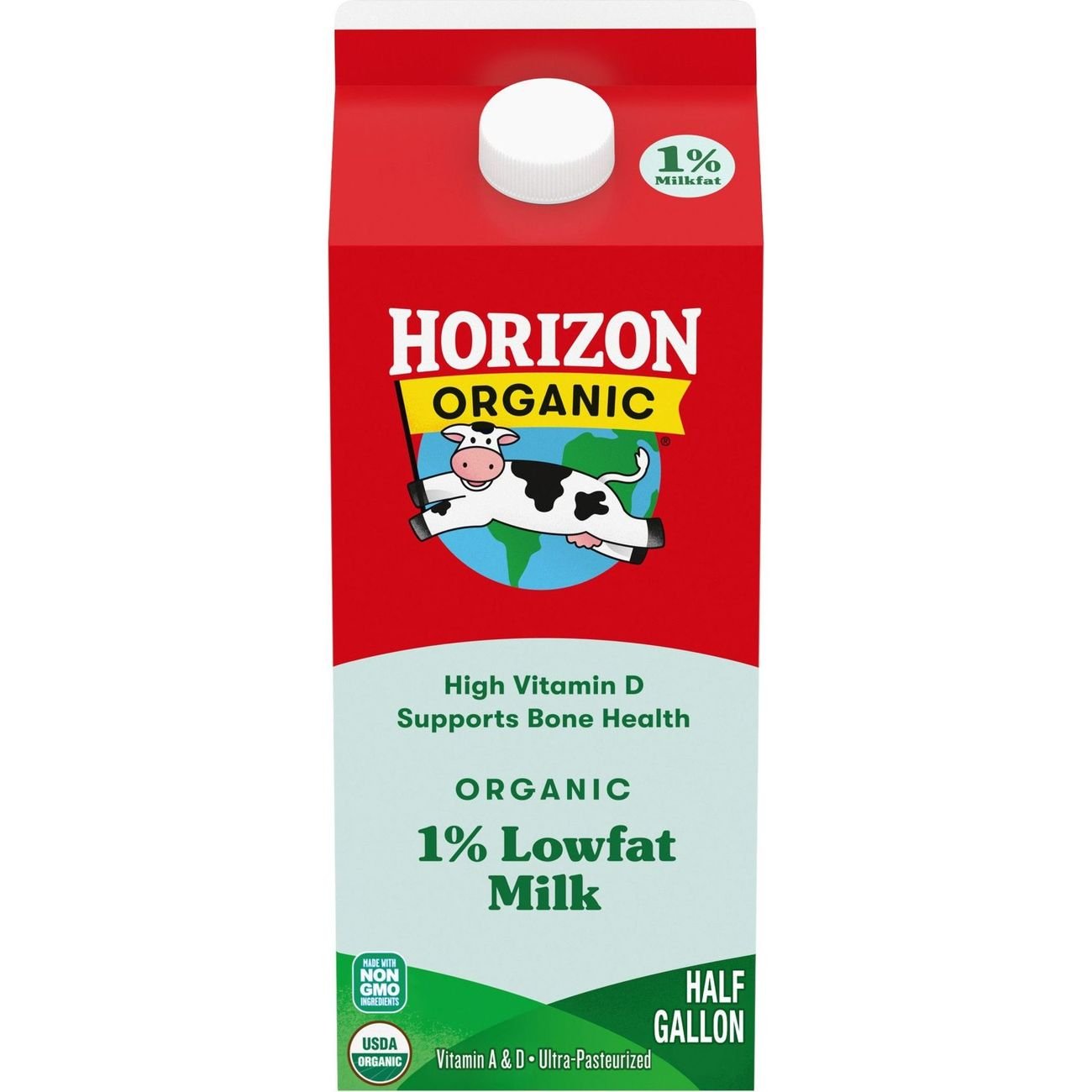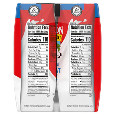 Horizon Organic Whole Milk *Horizon Organic Whole Milk has 4.5mcg and 25% DV vitamin D (this is 10% more of the daily value). Typical whole milk has 2.5mcg and 15% DV vitamin D. USDA ... Horizon Organic Whole Milk - Shop Milk at H-E-B 150 calories per cup. USDA organic. Our farms produced this milk without antibiotics, added hormones, pesticides or cloning. Certified organic by Quality ... Horizon Organic 1% Lowfat Milk - Shop Milk at H-E-B Nutrition Facts · Amount Per Serving. Calories. 110 · % Daily Value · Cholesterol. 15mg; 5% · Sodium. 135mg; 6% · Potassium. 420mg; 8% · Calcium. 310mg; 25% · Iron.